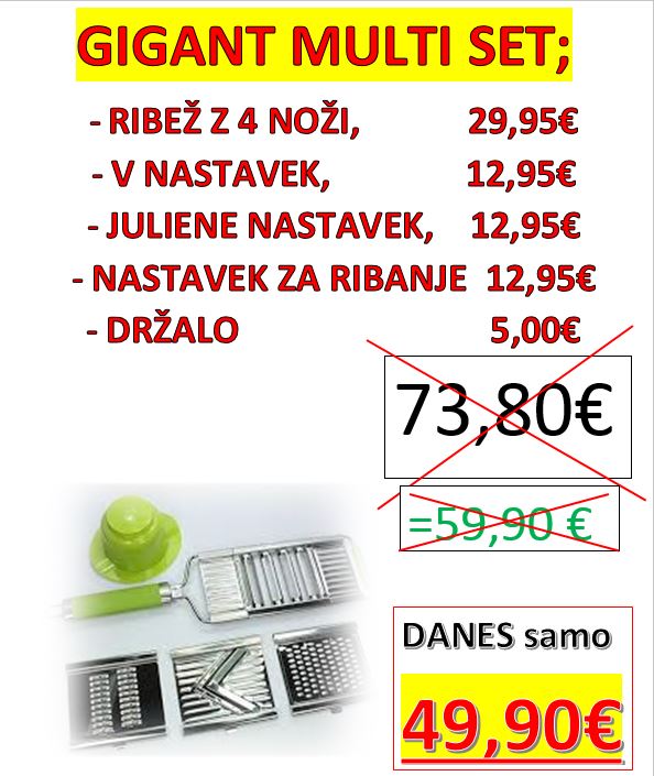 - NASTAVEK Z ŠTIRIMI REZILI; primeren je za na tanko rezanje vsega sadja in zelenjave – a pazite reže 4x v eno smer in 4x v drugo, zelo praktičen je za rezanje zelja… PROTI KONCU UPORABLJAJTE DRŽALO!